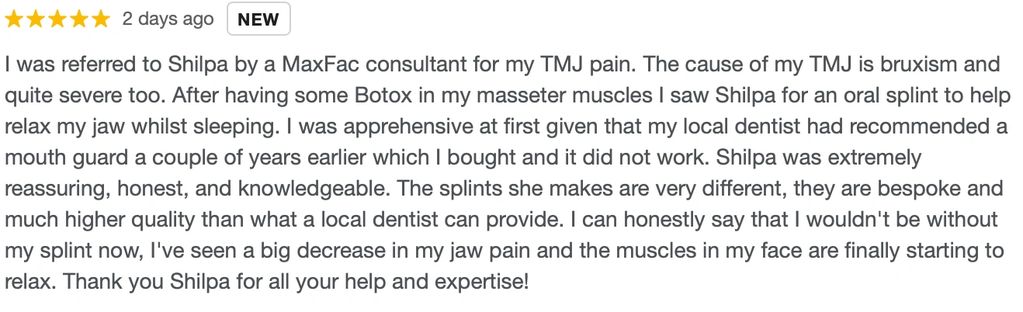 All patients receive a comprehensive TMJ assessment carried out by Dr Shilpa Shah, who takes a holistic and evidence-based approach to diagnosing and managing TMJ-related conditions.